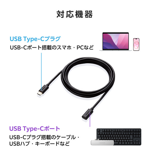 ●スマートフォンの充電ケーブルやUSBハブ、ドッキングステーションなどの長さが足りないときに便利な、USB Type-C延長ケーブル(USB2.0)です。USB Power Deliveryに対応し、最大20V/3Aの60W充電が可能です。 ※USB Power Delivery をご利用になる場合は、接続する機器および延長するケーブルがUSB Power Delivery に対応している必要があります。