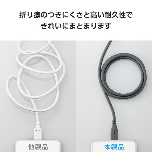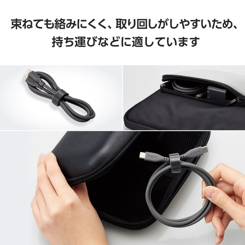 ●シリコン素材を採用した、なめらかな手触りのケーブルです。束ねて持ち歩いても絡みにくいのが特長です。
