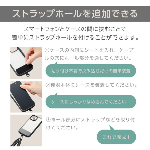 ●スマートフォンとケースの間に挟むだけでストラップホールを追加できる、1口タイプのストラップホールシートです。お使いのスマートフォンケースのケーブル穴に通すだけで使用できます。ケースを変えても繰り返し使用でき、装着したままでもイヤホンや充電ケーブルの接続が可能です。引っ張りに強いリベット構造を採用した高耐久タイプです。