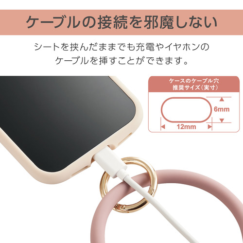 ●ケースにストラップホールがなくても、付属のストラップホールシートをスマートフォンとケースの間に挟むだけで使用でき、取り外しも簡単です。