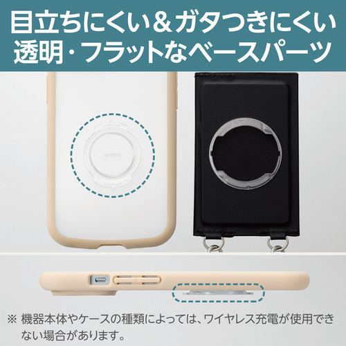 ●透明なベースパーツは、お好きなケースの背面に強力な粘着テープでしっかりと貼り付けることが可能。フラットな設計なので背面を下にして置いてもガタつきにくいです。