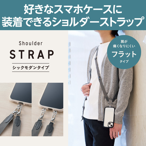 ●肩から掛けられ、バッグやポケットから取り出さなくてもすぐにスマートフォンの操作ができるフラットタイプのショルダーストラップです。