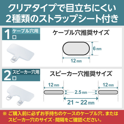 ●ケーブル穴1口タイプとスピーカー穴2口タイプの2種類のストラップホールシート(透明)が付属しているので、どちらのタイプのケースにも使用できます。