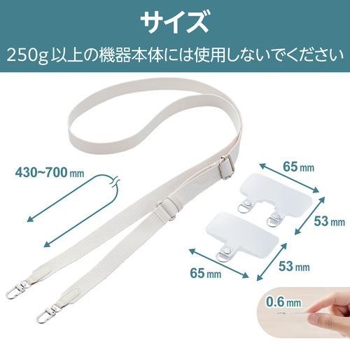 サイズ:ショルダーストラップ:全長約430mm〜約700mm、ストラップホールシート:W65mm×D0.6mm×H53mm