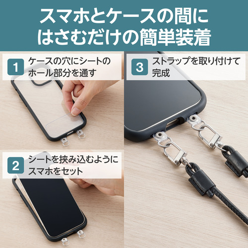 ●ケースにストラップホールがなくても、付属のストラップホールシートをスマートフォンとケースの間に挟むだけで使用でき、取り外しも簡単です。