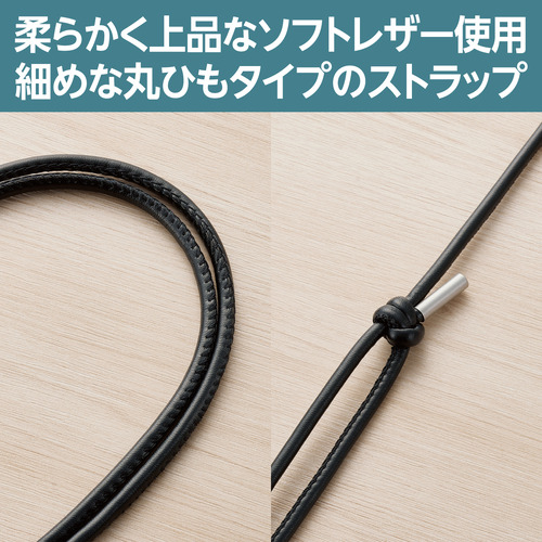 ●ストラップは4mmと細めな丸ひもタイプ。結び目をスライドさせることでお好みの長さに調節できます。