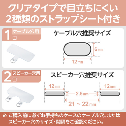 ●ケーブル穴1口タイプとスピーカー穴2口タイプの2種類のストラップホールシート(透明)が付属しているので、どちらのタイプのケースにも使用できます。