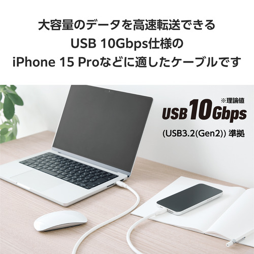 ●充電はもちろん、動画など大容量のデータ転送がスムーズに。iPhone 15 ProシリーズなどUSB 10Gbps(USB3.2(Gen2))仕様のスマートフォン・タブレットで、容量の大きなデータの高速転送が可能なUSB Type-C(TM)ケーブルです。最大100WのUSB Power Deliveryに対応しています。
