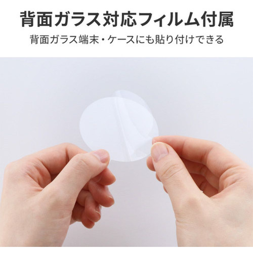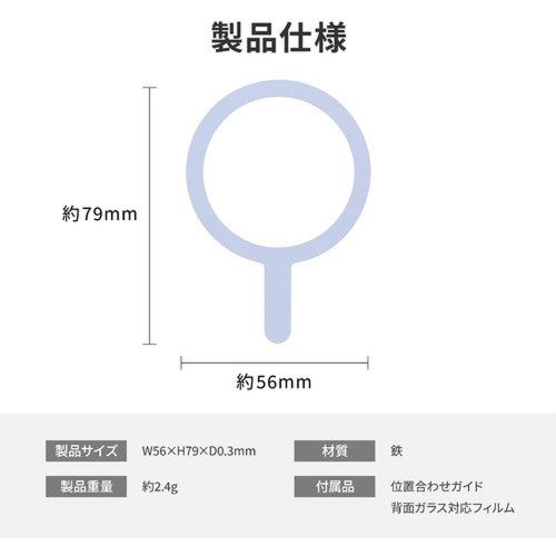 お気に入りのケースがMagSafe対応に!後付けで貼り付けて、MagSafe対応のリングやカードホルダーの利用が可能。約0.3mmの極薄形状で背面を下にしてもガタつきにくい。背面がガラスの端末/ケースでも使用できる吸着強化フィルム付属。端末中央に貼り付けできる位置合わせガイド付属。