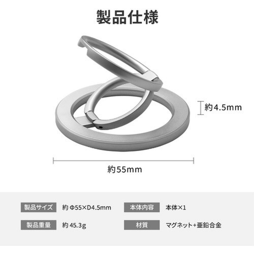 iPhone12シリーズ以降の端末に使用可能な、マグネット式スマートフォンリング。強力な磁力でしっかり吸着し落下を防ぐ。シールなどの貼り跡が残ることもなく、リングが不要なときはマグネットで簡単に取り外し可能。平たく折りたためる形状で、背面を下にしてもガタつきにくい。二重のリングは用途に応じて角度を調節でき、リングだけでなくスタンドやフックとしても使用可能。