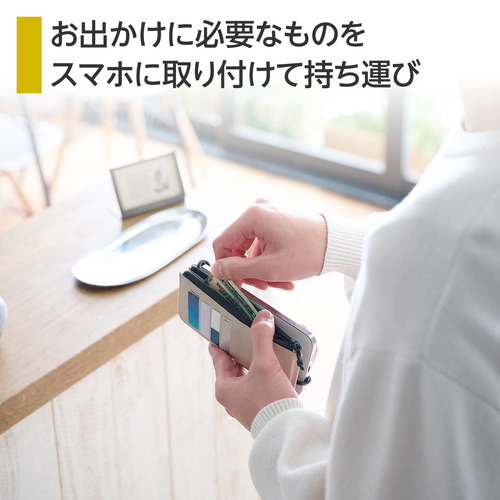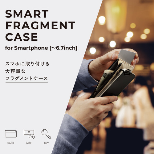 ●スマートフォンひとつでお出かけできる!カード類や現金など、外出する際に必要なものをまとめて収納できる大容量なフラグメントケースです。スマートフォンの角にフックを引っ掛けるだけで簡単に取り付け可能。スマートフォンとフラグメントケースの間に手を入れることで、落下防止バンドとしても利用できます。