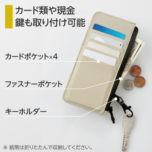 ●カードが約4枚入る前面のポケットと、小銭や折りたたんだ紙幣を収納できるファスナーポケットが付いています。