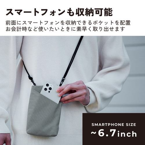 ●前面にスマートフォンを収納できるポケットを配置。お会計時など使いたいときに素早く取り出せます。