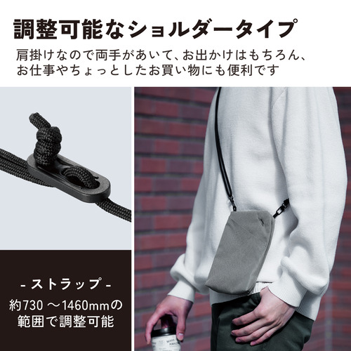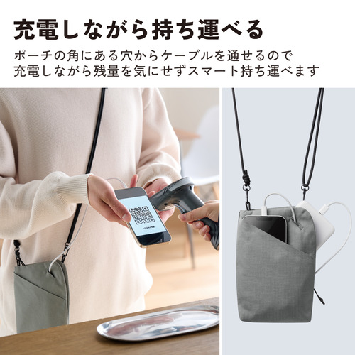 ●充電しながらスマートフォンを持ち運べる!スマートフォン、カード類や現金、小物など必要なものをまとめてコンパクトに持ち運べるショルダーポーチです。充電器をポーチに入れたままスマートフォンの操作ができ、バッテリー残量を気にすることなく決済が可能です。