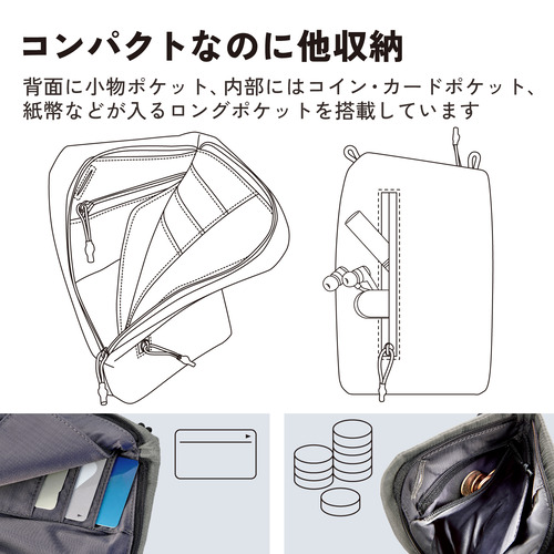 ●約3枚入るカードポケットと小銭が入るコインポケットは、それぞれポーチ内部の上部に付いているため出し入れしやすい仕様になっています。