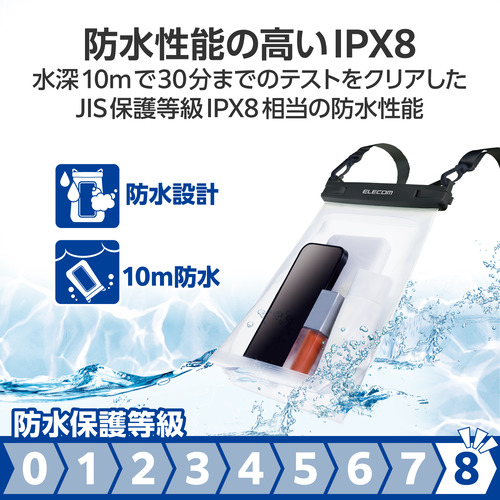 ●JIS保護等級IPX8相当の防水性能を実現する、水深約10mで30分までの防水テストをクリアした大容量タイプのスマートフォン用防水ケースです。