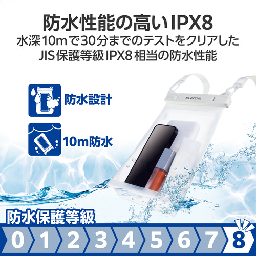 ●JIS保護等級IPX8相当の防水性能を実現する、水深約10mで30分までの防水テストをクリアした大容量タイプのスマートフォン用防水ケースです。