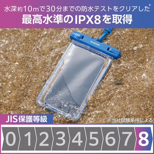 ●JIS保護等級IPX8相当の防水性能を実現する、水深約10mで30分までの防水テストをクリアした蓄光機能付きスマートフォン用防水ケースです。