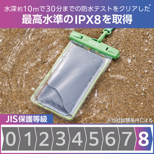 ●JIS保護等級IPX8相当の防水性能を実現する、水深約10mで30分までの防水テストをクリアした蓄光機能付きスマートフォン用防水ケースです。