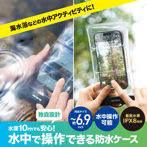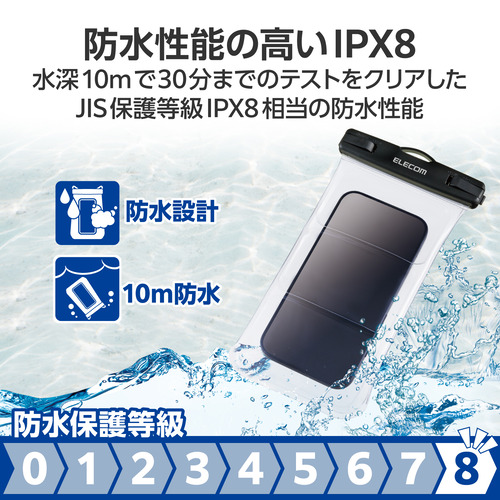 ●JIS保護等級 IPX8相当の防水性能を実現する、水深約10mで30分までの防水テストをクリアした水中タッチ操作対応のスマートフォン用防水ケースです。