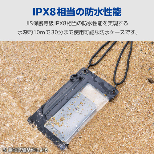 ●JIS保護等級IPX8相当の防水性能を実現する、水深約10mで30分までの防水テストをクリアした気密ファスナータイプのスマートフォン用防水ケースです。