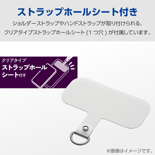 ●ショルダーストラップやハンドストラップが取り付けられる、ストラップホールシート(1つ穴・半透明タイプ)が付属しています。