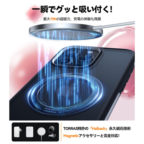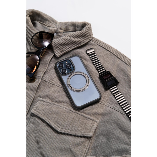 滑り止め凹面デザインで握りやすく、指紋やほこりがつきにくいコーティングも備えています。マグネットスタンドは360度回転可能で、MagSafeアクセサリにも対応しています。ストラップホールあり。