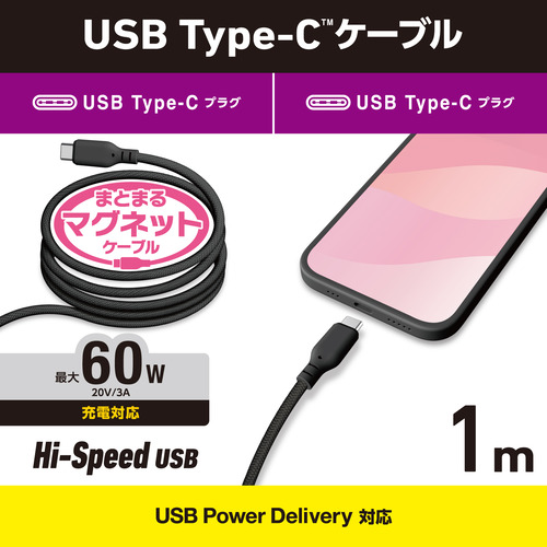 エレコム MPA-CCMG10BK まとまるマグネットケーブル(USB Type-C - USB Type-C/60W対応) 1m