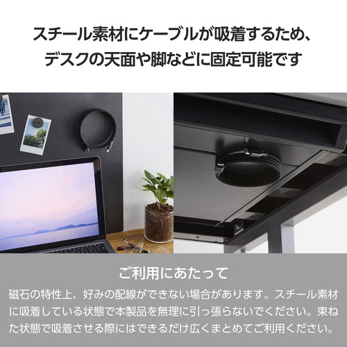 ●スチール素材にケーブルが吸着するため、デスクの天面や脚などに這わせて固定可能。デスク周りをすっきり見せられます。