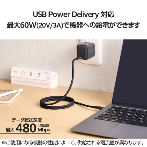 ●USB Power Delivery最大60Wに対応し、スマートフォンもパソコンもこれ1本で高速充電が可能です。