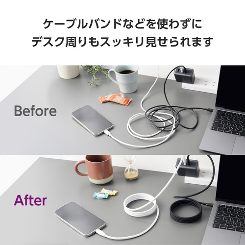 ●磁石の力でくるんとまとまる!USB Type-C(TM)(USB2.0)ケーブルです。マグネット内蔵のケーブルだからきれいにまとまり収納や持ち運びに便利。USB Power Delivery最大60Wに対応し、スマートフォンもパソコンもこれ1本で高速充電が可能です。 ※60W以上のUSB Power Delivery対応充電器に接続した場合、充電は可能ですが出力は60Wに制限されます。