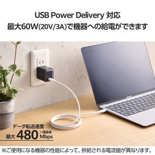 ●USB Power Delivery最大60Wに対応し、スマートフォンもパソコンもこれ1本で高速充電が可能です。