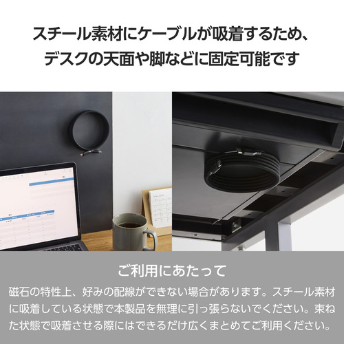 ●スチール素材にケーブルが吸着するため、デスクの天面や脚などに這わせて固定可能。デスク周りをすっきり見せられます。