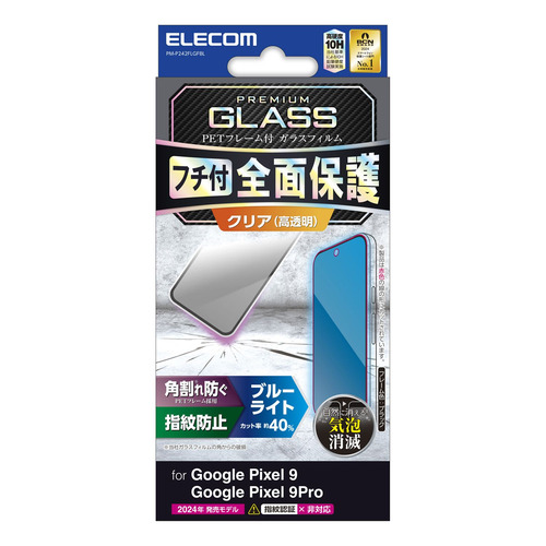 エレコム PM-P242FLGFBL Google Pixel 9/9 Pro ガラスフィルム フレーム付き 高透明 ブルーライトカット