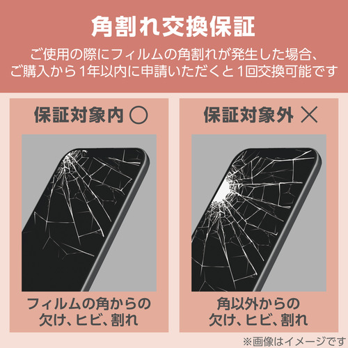 ●本製品をご使用の際に、フィルムの角が「欠けた」、「ヒビが入った」、「割れた」場合、ご購入より1年以内に申請いただくことで、フィルムの交換が1回可能になるサービスです。