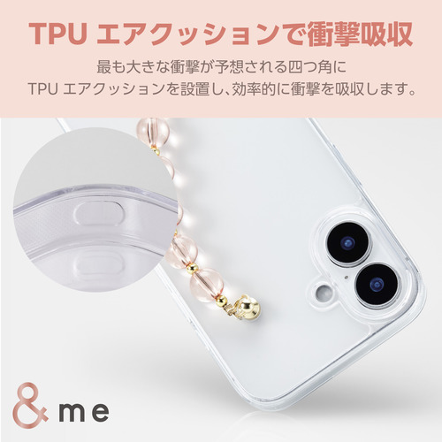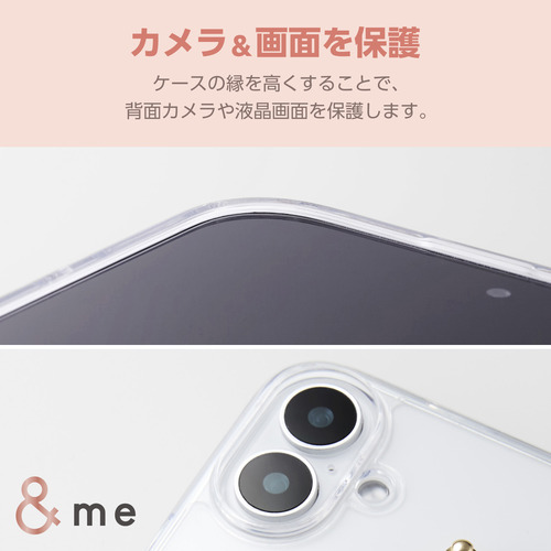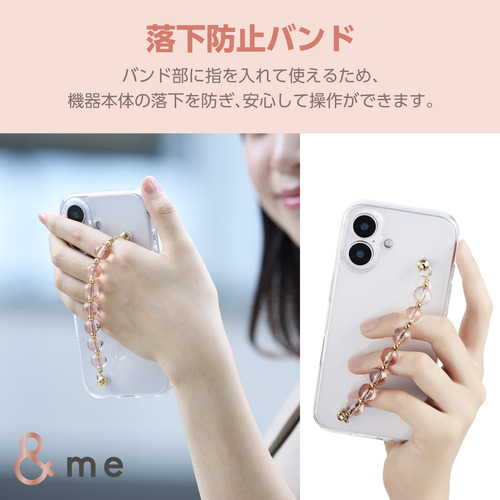 ●側面に弾力性のあるTPU(熱可塑性ポリウレタン)素材を、背面に強じんで透明度の高いポリカーボネート素材を使用しています。手を通せるビーズタイプのハンドバンドを装着した、&meシリーズのスリムなスタイルのハイブリッドケースです。