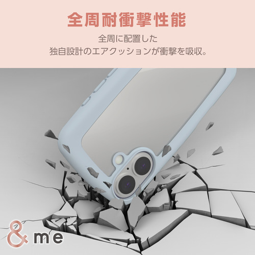●全周に配置した独自設計のエアークッションが衝撃を吸収し、背面には高硬度のポリカーボネート素材を採用した、フレームがぷっくりと丸い&meシリーズのハイブリッドケースです。