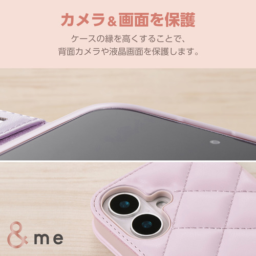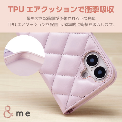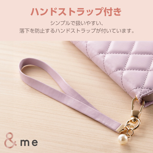 ●クラシカルで上品なキルティングデザイン。落下防止用のハンドストラップが付属した、&meシリーズの手帳型ソフトレザーケースです。