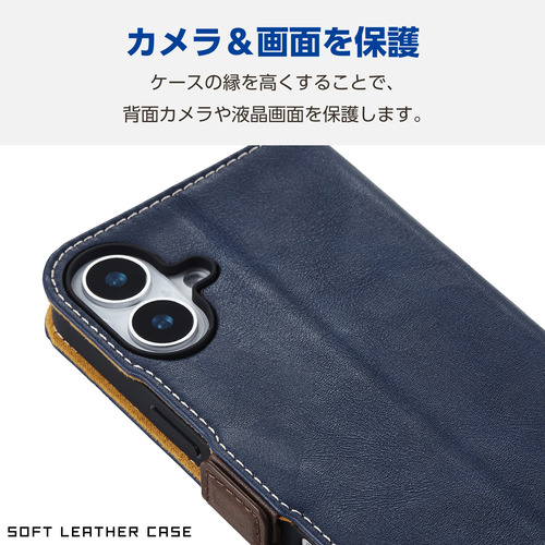 エレコム PM-A24BPLFYNV iPhone 16 Plus ソフトレザーケース 磁石付 耐衝撃 ステッチ