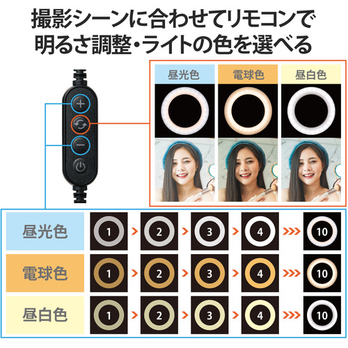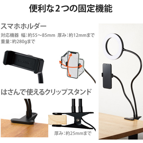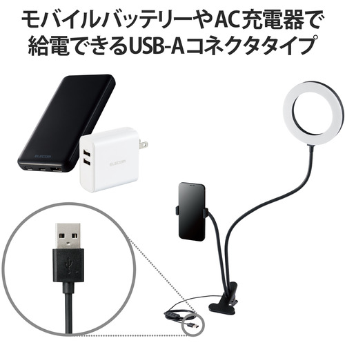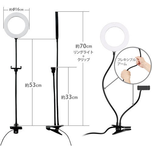 エレコム DE-L01BK LEDリングライト 16cm クリップスタンド 3色モード 10段階調光 USB給電 ブラック