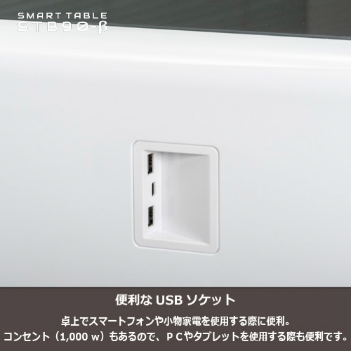 卓上でスマートフォンや小物家電を使用する際に便利なコンセント(1000W)もあるので、PCやタブレットを使用する際も便利です。