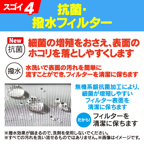 抗菌・撥水フィルター:無機系銀抗菌加工により、細菌が増殖しやすいフィルター表面を清潔に保ちます。さらにフィルターについたホコリも撥水なので楽々お掃除が可能。