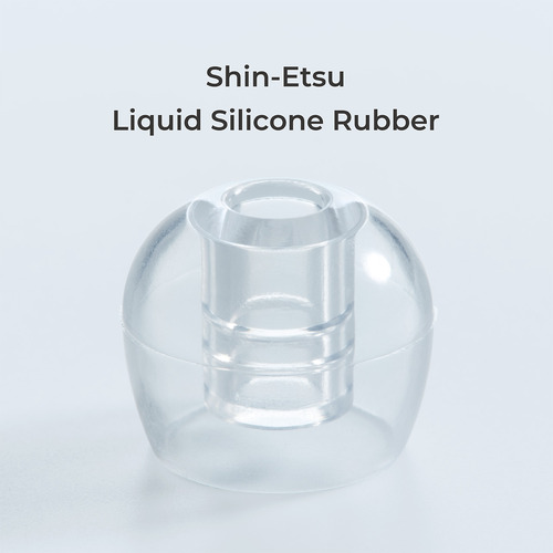 イヤーピースの素材として最適な、日本を代表する化学メーカーである信越化学工業株式会社製のLSR(LiquidSiliconeRubber)を採用。LSRは白金(プラチナ)化合物の付加反応により硬化させることで、優れた物性と非毒性を兼ね備えた無臭の液状シリコーンゴムです。一般的なシリコンや熱可塑性エラストマー(TPE)と比較して、極めて柔軟性が高いため、引き裂きに強く、圧縮永久歪み(圧縮変形に対するへたり性)が低く、摩耗や損傷に対する耐久性にも優れています。そのため、イヤホンを長時間装着しても耳に負担をかけることなく、高品位な音質を持続的に楽しむことができます。さらに、FDA(アメリカ)およびLFGB(ドイツ)が定める医療機器や食品などの安全基準に準拠した生体適合性の高いメディカルグレードの安全性を備えており、デリケートな肌質の方でも安心してご使用いただけます。また、透明度が高く、時間の経過による劣化が生じにくいため、オーディオアクセサリとしてイヤホンをいつまでも美しく引き立てることができます。※医療品に近い品質であり、医療用素材ではありません。