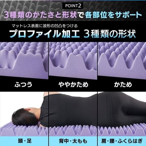 マットレス表面の凹凸を3種類の形状にし、サポートする部位に合わせてかたさを変えることで、体圧を分散させ負担のかかりにくい寝姿勢を促します。