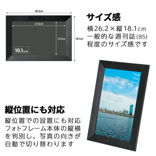 フォトフレーム本体の縦横を判別し、写真の向きが自動で切り替わります。縦置きでも横長の写真を正しい向きで表示できます。