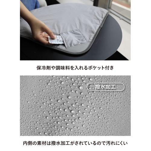 下に敷けばランチョンマットになったり、保冷剤や調味料を入れるポケットが付いていたり。