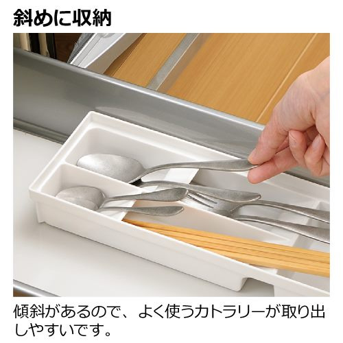 斜めに収納:傾斜があるので、よく使うカトラリーが取り出しやすいです。箸置きなどの小物も収納できます。
