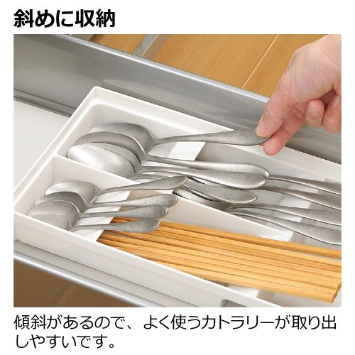 斜めに収納:傾斜があるので、よく使うカトラリーが取り出しやすいです。箸置きなどの小物も収納できます。