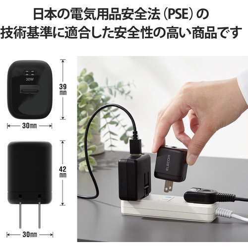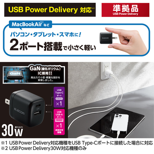 エレコム MPA-ACCP30BK USB Type-C 充電器 PD 対応 最大出力30W タイプC ×1 タイプA ×1 GaN 小型 軽量 Type C USB-C コンセント ブラック