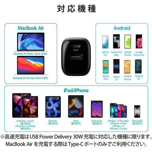 ※USB Power Delivery 30W充電に対応した機種に限ります。